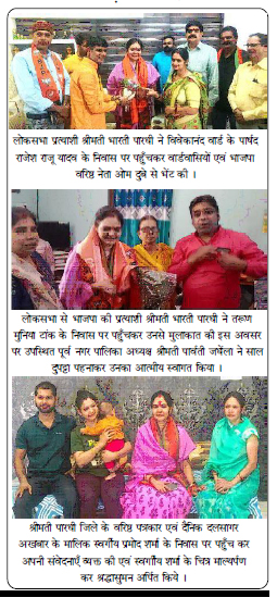 भाजपा जिला सह मीडिया प्रभारी मनोज मर्दन त्रिवेद ने बताया कि श्रीमती पारधी आज जिले के वरिष्ठ पत्रकार व दैनिक दलसागर के संपादक दिवंगत प्रमोद शर्मा के परिवार से भेंट करने उनके निवास पर पहुँची, जहाँ उन्होंने उनके परिजनों से भेंटकर संवेदना व्यक्त की । इसके पूर्व इसके पूर्व श्रीमती पारधी पार्टी कार्यकर्ता नरेन्द्र $गुड्डू ठाकुर, तरूण मुनिया टांक, पार्षद राजू यादव, निरंजन मिश्रा, प्रहलाद पटेल कोनियापार सहित अनेक पार्टी कार्यकर्ताओं के निवास पहुँचकर भेंट व चर्चा की ।