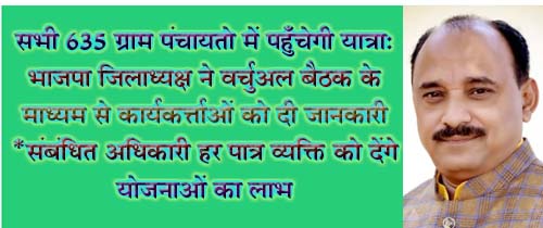 भाजपा जिलाध्यक्ष आलोक दुबे ने विकसित भारत संकल्प यात्रा के संबंध में जानकारी देते हुये बताया कि यात्रा जिले के आठों विकासखंड में एक साथ चलेगी और यह यात्रा प्रतिदिन दो ग्राम पंचायतों में पहुँचेगी । इस यात्रा में सुविधा अनुसार हमारे सांसद एवं विधायक, जिला पंचायत अध्यक्ष, सदस्य गण, जनपद पंचायतो के अध्यक्ष, सदस्यों की उपस्थिती सुनिश्चित कराने की जिम्मेदार कार्यकर्ता चिंता करें । यात्रा में अपने कार्य क्षेत्र के पदाधिकारी आवश्यक रूप से शामिल रहे ।
