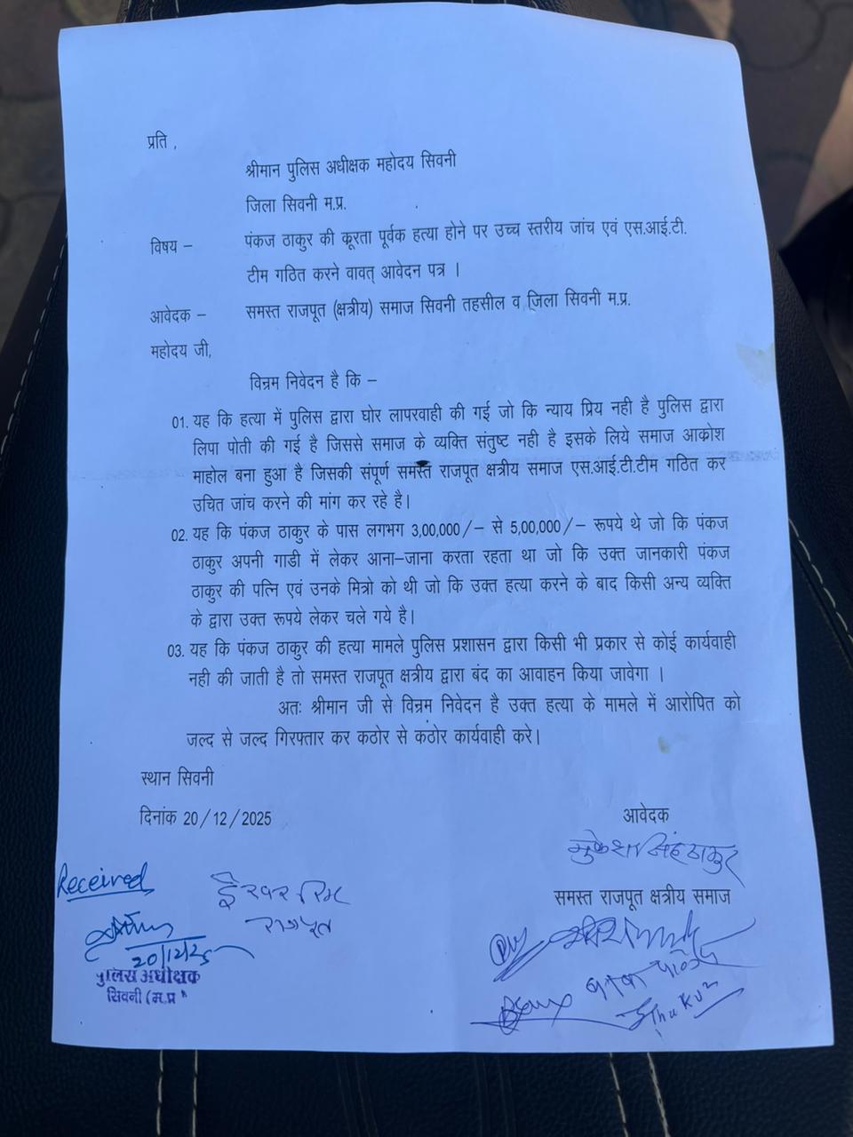 इसी क्रम में समस्त राजपूत (क्षत्रीय) समाज सिवनी द्वारा पुलिस अधीक्षक महोदय, जिला सिवनी (म.प्र.) को लिखित ज्ञापन सौंपा गया।